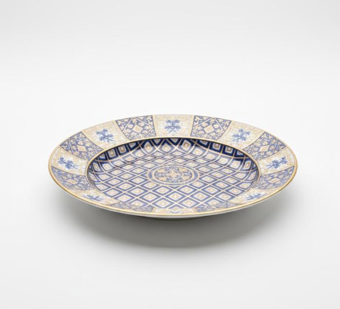 En dekorativ tallerken med et geometrisk mønster i midten og felter med ornamenter rundt langs...