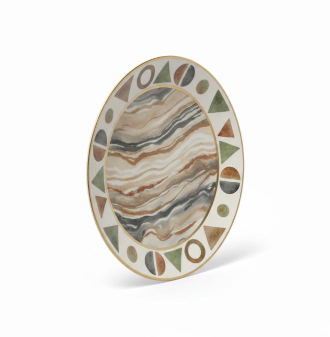 En dekorativ tallerken med en marmoreret midte i flere farvetoner og en kant med geometriske...