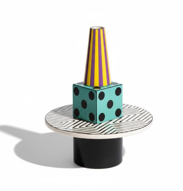 En dekorativ vase opbygget som en lodret konstruktion af sammenkoblede geometriske former. Formen består af...