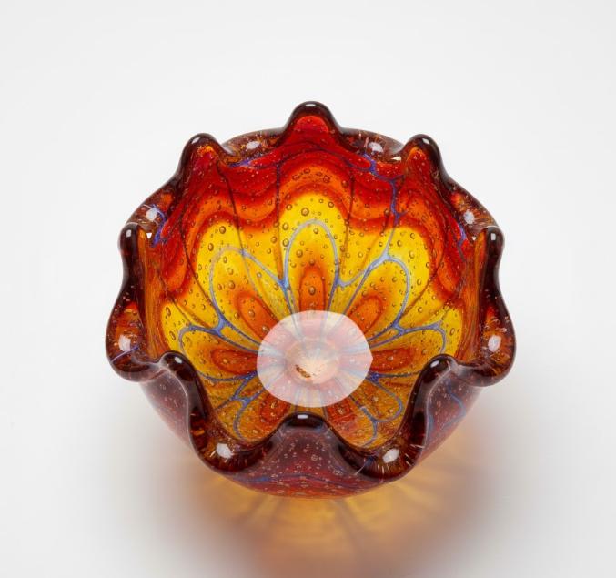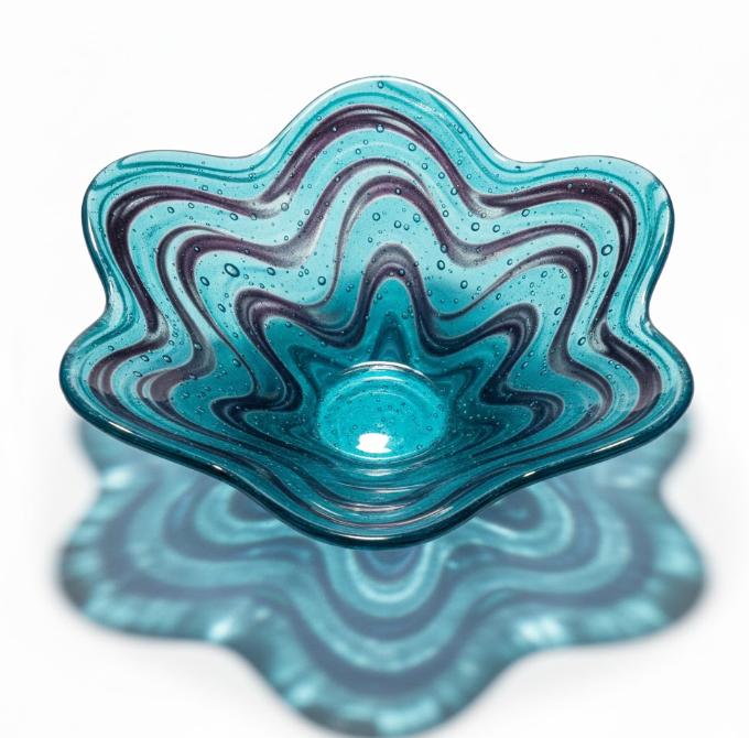 Dekorativ glasskål med bølget kant og lagdelt mønster