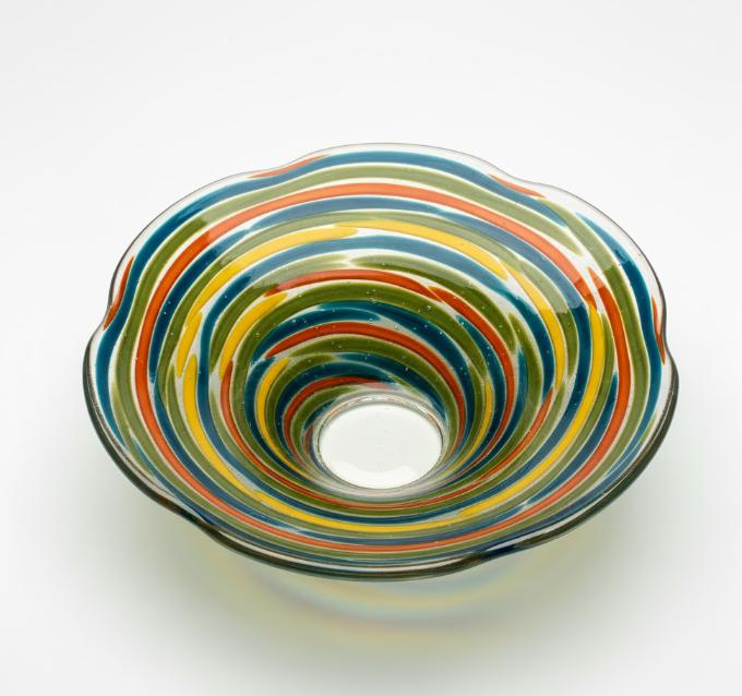 En dekorativ glasskål med rund form og bølget kant. Skålen viser koncentriske farvebånd, der løber...