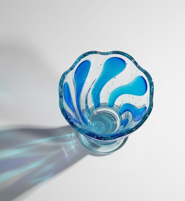 En dekorativ glasskål med rund form og bølget kant. Skålen viser aflange farvefelter, der strækker sig lodret fra bunden og op mod kanten. Farvefelterne er placeret jævnt rundt i skålen, og i glasset ses små luftbobler fordelt over hele den indvendige flade.
