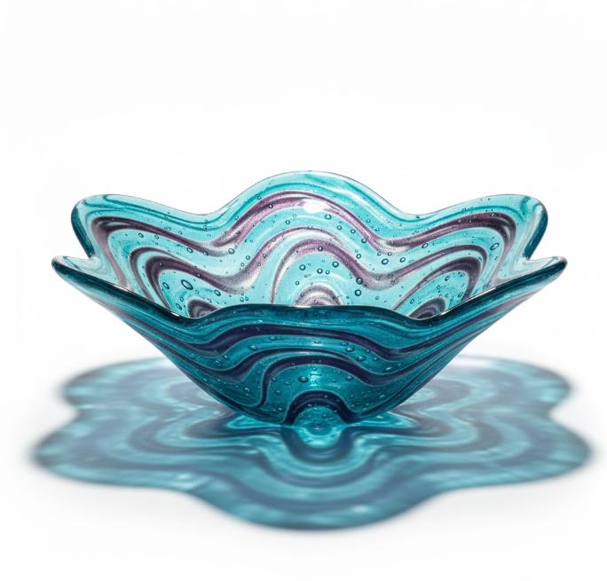 Dekorativ glasskål med bølget kant og lagdelt mønster
