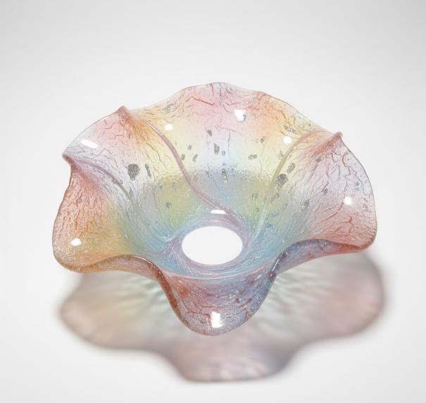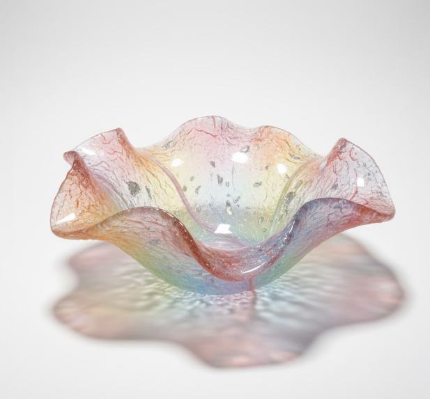 En dekorativ glasskål med åben, organisk form og uregelmæssigt bølget rand. Skålen viser farveovergange i flere nuancer, som er fordelt ujævnt i hele glasset. Overfladen indeholder små indeslutninger og variationer, der følger skålens form fra bund til kant.
