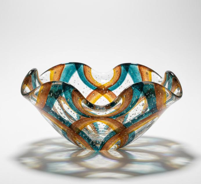 En dekorativ glasskål med rund form og bølget kant. Skålen viser buede farvebånd, der krydser hinanden symmetrisk fra midten og ud mod kanten. I glasset ses små luftbobler, som er fordelt jævnt i hele skålens opbygning.