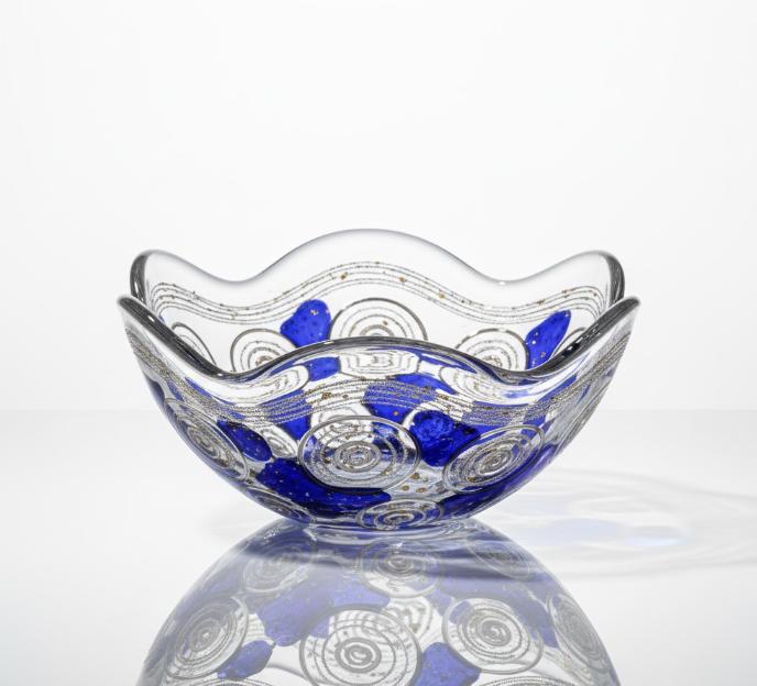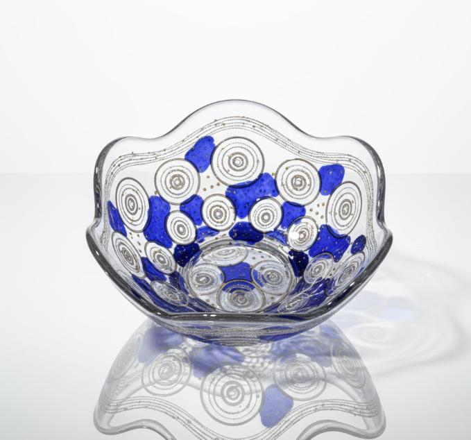 En dekorativ glasskål med rund form og bølget kant. Skålen viser gentagne cirkulære mønstre i flere størrelser, som er placeret jævnt over den indvendige flade. Mellem cirklerne ses uregelmæssige blå felter, og mønsteret følger skålens form fra bunden og op mod kanten.