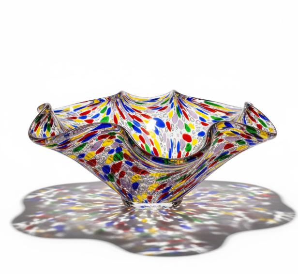 En dekorativ glasskål med bred, åben form og bølget kant. Skålen viser et mønster af små flerfarvede prikker, der er fordelt tæt i hele glasset. Prikkerne følger skålens opbygning fra bunden og ud mod kanten, og formen er samlet omkring en smallere fod.