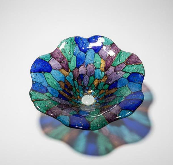 En dekorativ glasskål med rund form og bølget kant. Skålen viser et mosaiklignende mønster bestående af uregelmæssige farvefelter, der er samlet i hele den indvendige flade. Farverne er placeret tæt sammen og følger skålens form fra midten og ud mod kanten.