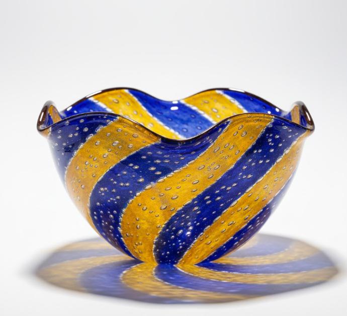 En dekorativ glasskål med rund form og bølget kant. Skålen viser et spiralformet mønster af brede farvebånd, der udgår fra midten og bevæger sig jævnt mod kanten. I glasset ses små luftbobler, som er spredt over hele den indvendige flade.