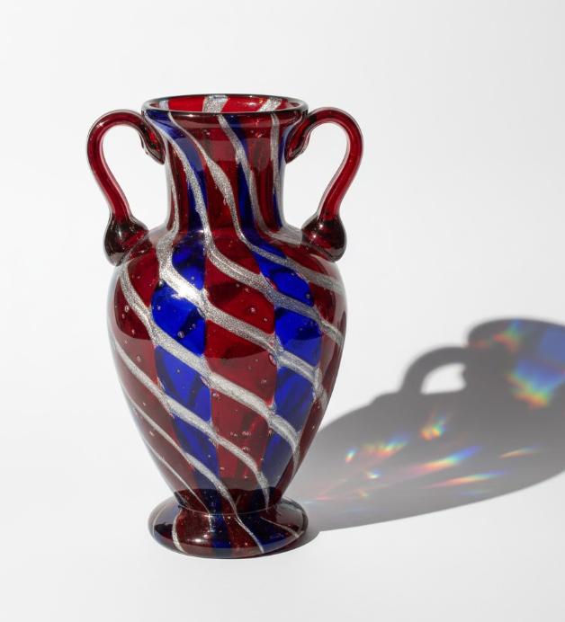 En dekorativ glasvase med opretstående form, smal hals og to symmetrisk placerede håndtag. Vasen viser spiralformede farvebånd, der løber diagonalt rundt om kroppen. Mønstret dækker hele overfladen og følger vasens form fra bund til åbning.