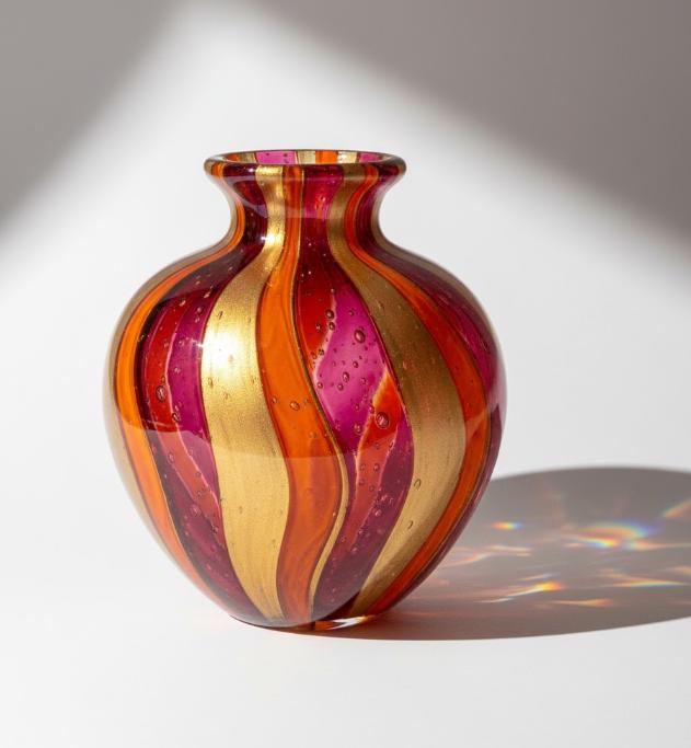 En dekorativ glasvase med rund krop og let indsnævret hals. Vasen viser lodrette farvebånd, der løber jævnt fra bunden og op mod åbningen. I glasset ses små luftbobler, som er fordelt i hele overfladen og følger vasens buede form.