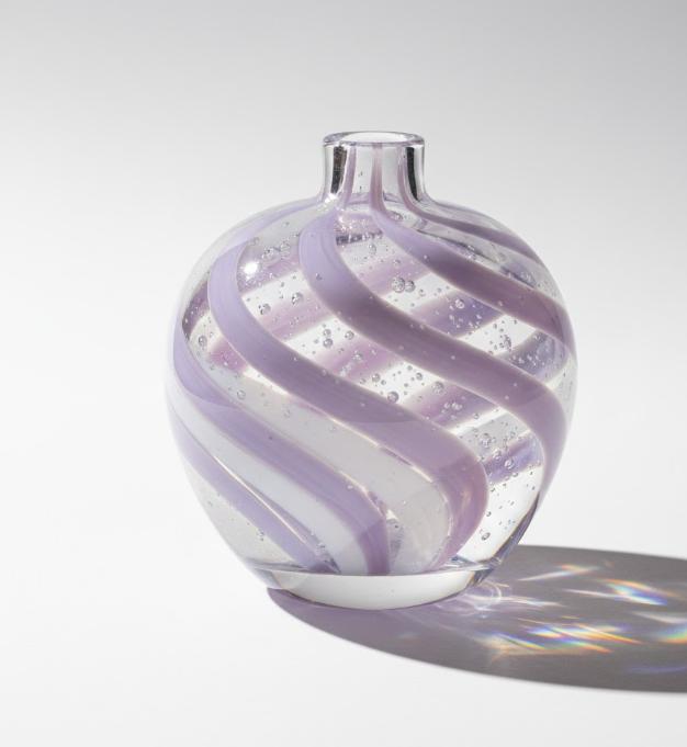 En dekorativ glasvase med rund krop og kort, cylindrisk hals. Vasen viser snoede bånd, der løber jævnt rundt om formen fra top til bund. I glasset ses små luftbobler, som er spredt i hele overfladen og følger vasens buede opbygning.