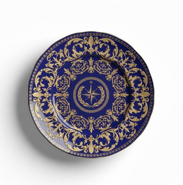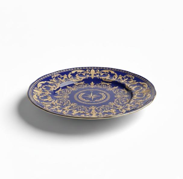 En dekorativ tallerken med dyb blå bund og detaljerede gyldne ornamenter langs både kant og midte. Tallerkenen har en markeret kantlinje og et midterfelt med kompasmotiv omgivet af mønstre. Den kan bruges som dekoration på væg, hylde eller bord.