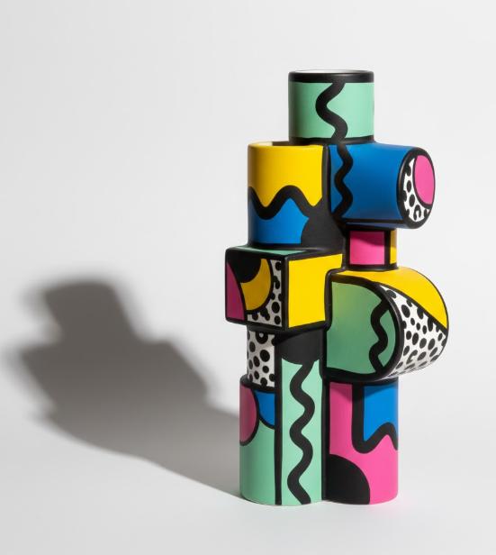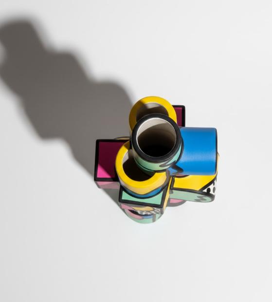En dekorativ vase opbygget som en lodret konstruktion af sammenkoblede geometriske former. Formen består af cylindre og blokke, der er forskudt i flere retninger og samlet i en kompakt struktur. Overfladerne viser kontrasterende farvefelter med bølgende linjer, prikmønstre og ensfarvede flader, som gentages på tværs af elementerne. Åbningen er placeret øverst i en lodret cylinder og er integreret i den samlede opbygning.